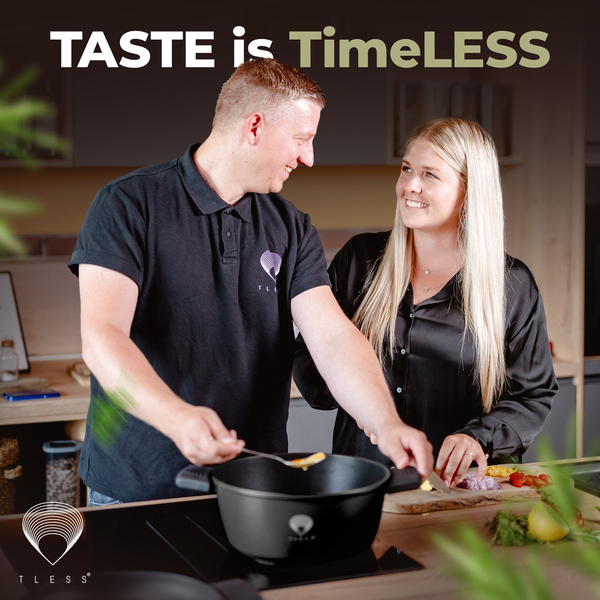 ZEITLOSE GESCHMACKSERLEBNISSE - Mach Kochen zu einem unvergesslichen Erlebnis und schaffe bleibende Erinnerungen. Verabschiede dich von minderwertigem Kochgeschirr und setze auf Qualität und Geschmack. Mit unserem Bräter zauberst du nicht nur köstliche Speisen, sondern auch strahlende Gesichter und unvergessliche Momente! Entdecke die Magie des Kochens - Taste is TimeLESS!