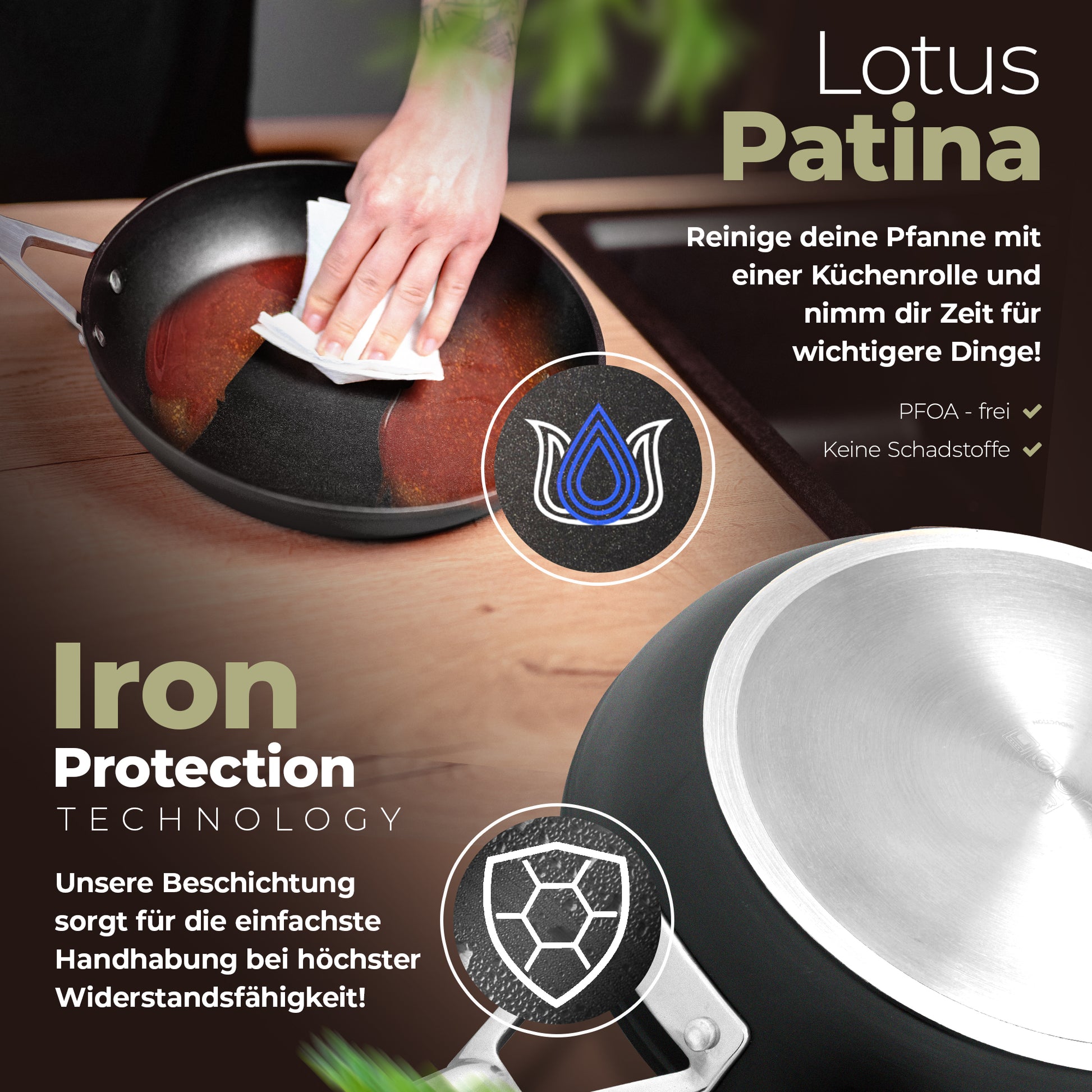 LEICHTER GENIESSEN - Im Vergleich zu herkömmlichen Pfannen bietet unser Produkt die perfekte Balance aus Leichtigkeit und Robustheit. Dank unserer innovativen IronProtection Technologie und der Lotus-Patina auf dem Aluguss erlebst du eine mühelose Handhabung und eine blitzschnelle Reinigung - für ein Kocherlebnis voller Leichtigkeit und Freude!