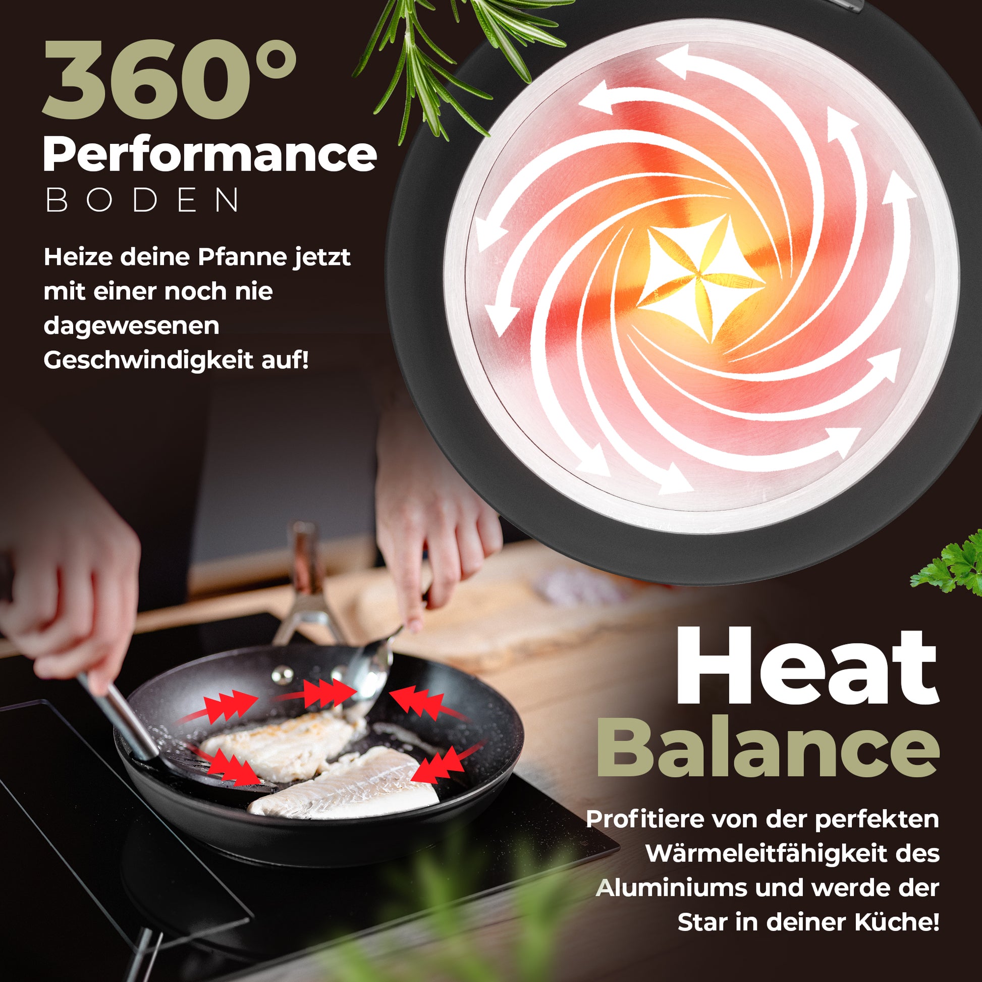 GLEICHMÄßIGKEIT GARANTIERT - Mit unserer Pfanne gehört einseitig angebranntes Essen der Vergangenheit an! Dank des 360° Performance Boden und seiner ausgezeichneten Wärmeleitung genießt du jedes Gericht gleichmäßig gegart und intensiv im Geschmack. Besonders Fleischgerichte entfalten so ihr volles Potenzial und verwöhnen deinen Gaumen mit jedem Bissen!
