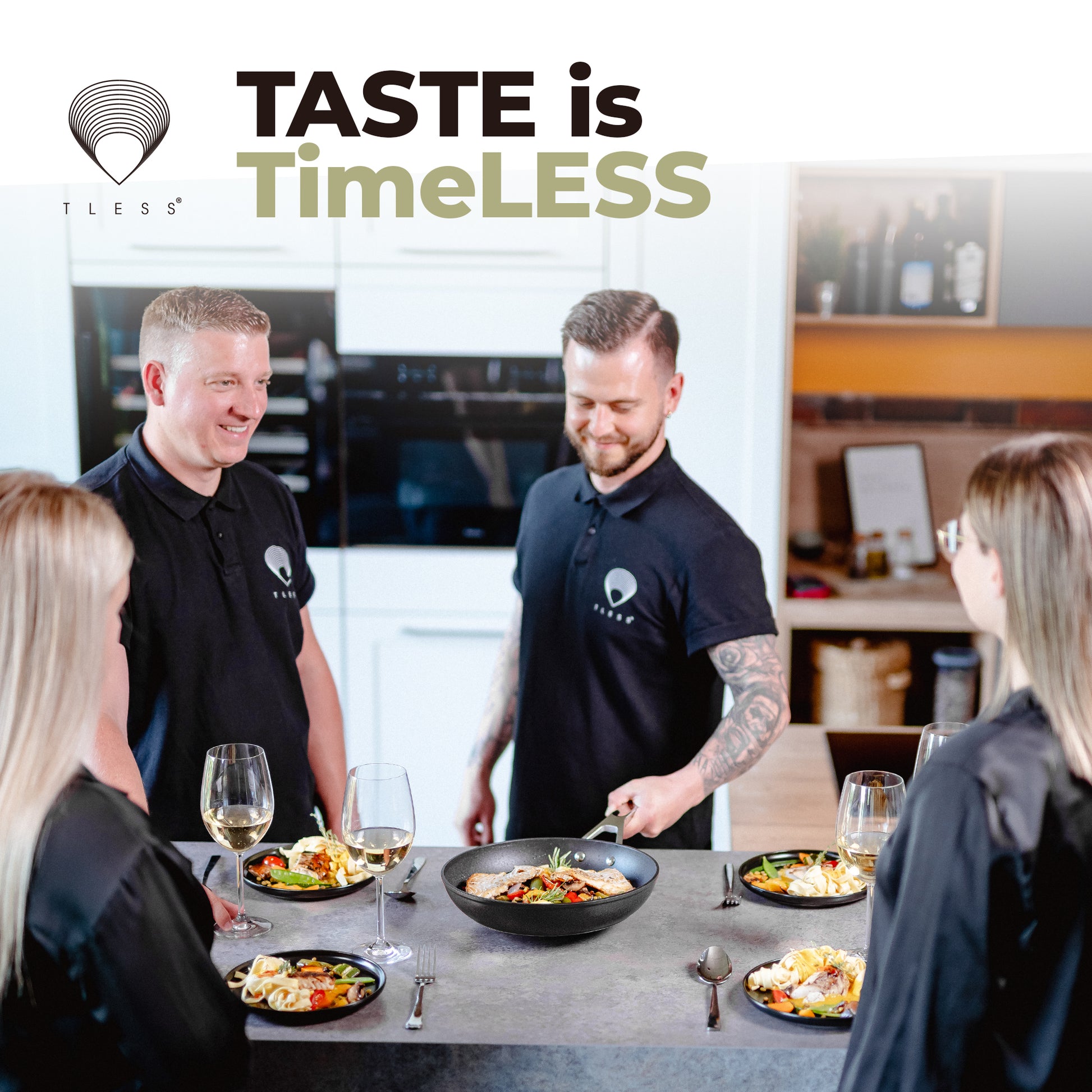 ZEITLOSE GESCHMACKSERLEBNISSE - Mach Kochen zu einem unvergesslichen Erlebnis und schaffe bleibende Erinnerungen. Verabschiede dich von minderwertigem Kochgeschirr und setze auf Qualität und Geschmack. Mit unserer Pfanne zauberst du nicht nur köstliche Speisen, sondern auch strahlende Gesichter und unvergessliche Momente! Entdecke die Magie des Kochens - Taste is TimeLESS!